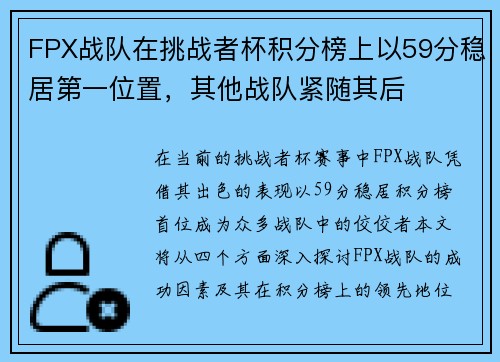 在本次冠军杯的赛季中,LNG战队以68分的优异成绩稳居积分榜第一名,展现了其强大的实力和团队配合能力。这一成绩不仅是对他们辛勤训练和努力付出的回报,也是对其他竞争对手的一种有力宣示。本文将从多个方面详细分析LNG战队的表现,包括他们在赛季中的关键比赛、团队成员的合作与默契、教练组的策略部署以及未来的...